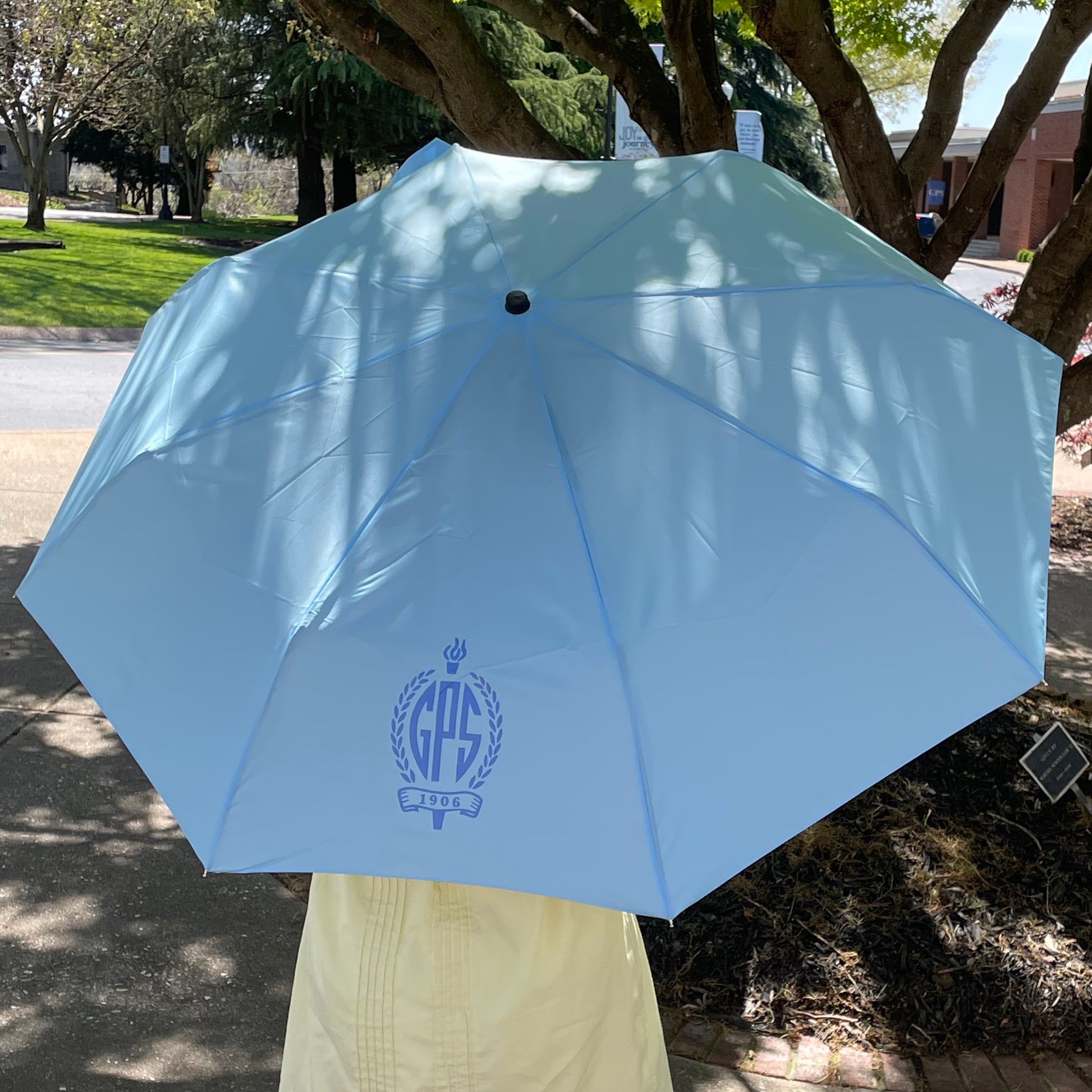 Super Mini-Compact Umbrella, in light blue with crest imprint on sleeve and umbrella, features a clip-on handle and folds to a mere 11 inches but covers 42".
