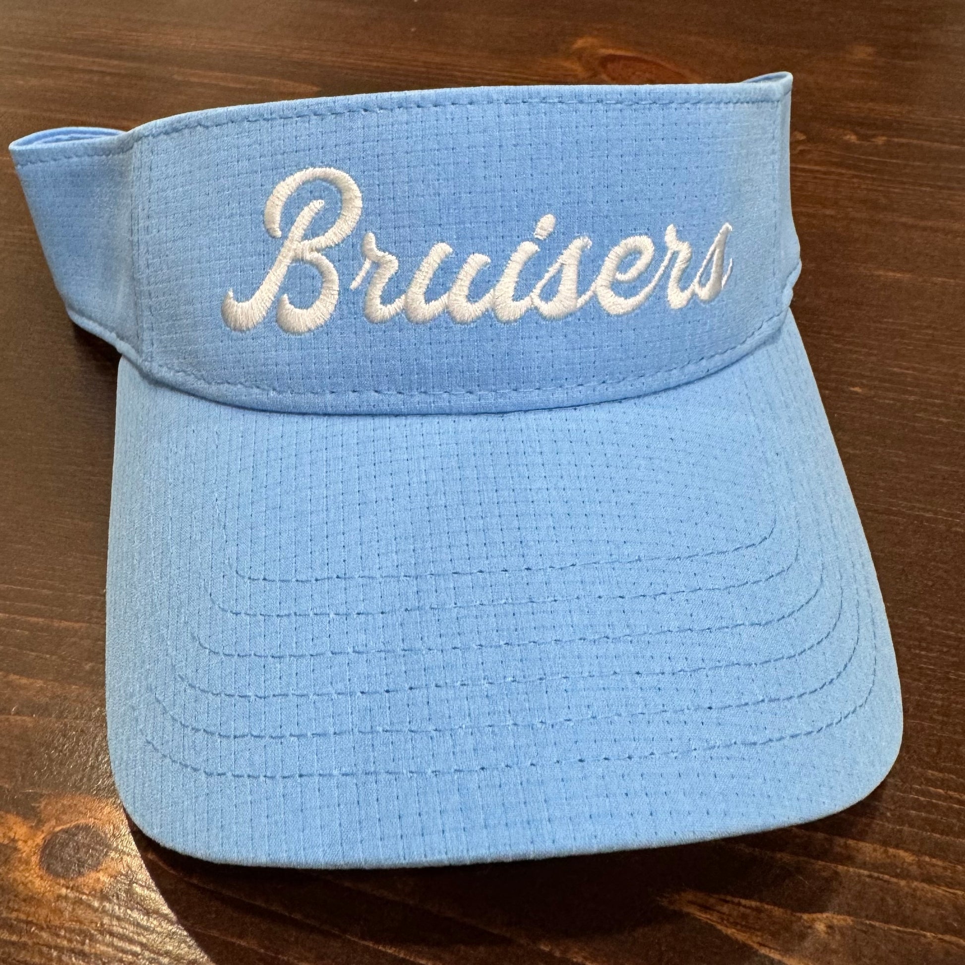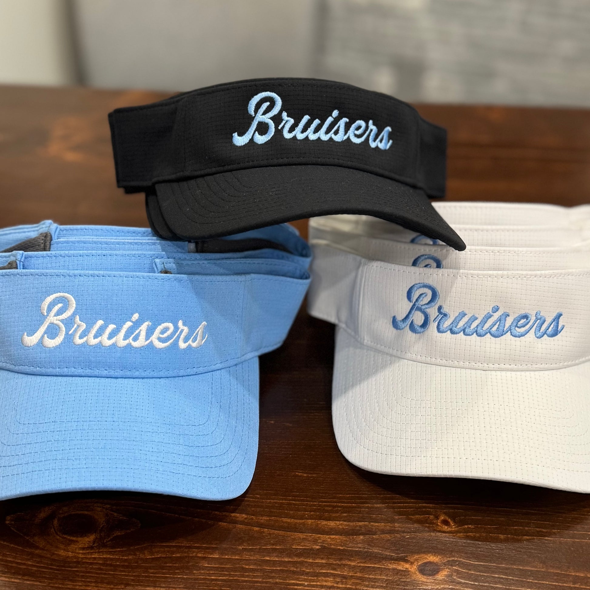 Black performance fabric visor with blue team embroidery, White with blue embroidery and now Bruiser Blue with white team embroidery.